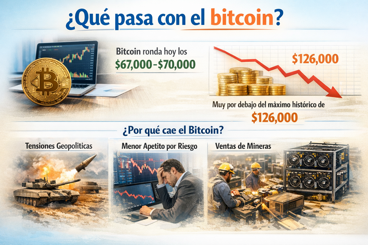 La caída se produjo tras una combinación de factores macroeconómicos, geopolíticos y financieros que están afectando al conjunto de los activos de riesgo. En el mercado internacional, el bitcoin llegó a caer por debajo de los 66.000 dólares, su nivel más bajo en meses, en medio de una venta generalizada de criptomonedas.